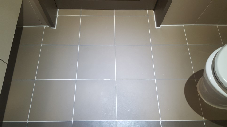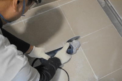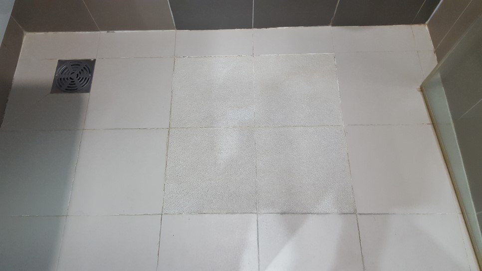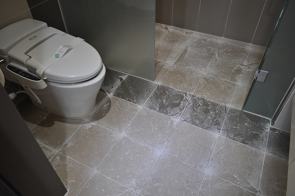 서울 건국대학교병원 VIP병동 화장실 타일바닥 줄눈시공 하기전에 오염된 백시멘트 제거중인 모습입니다.