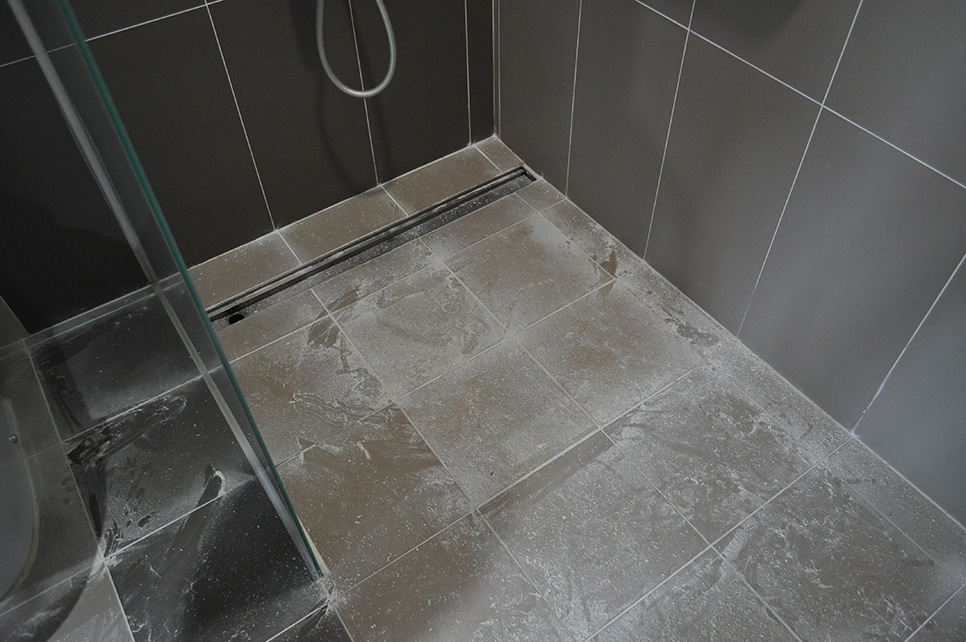 서울 건국대학교병원 VIP병동 화장실 욕실 타일 줄눈시공전에 오염된 백시멘트 제거하고있는 모습니다.